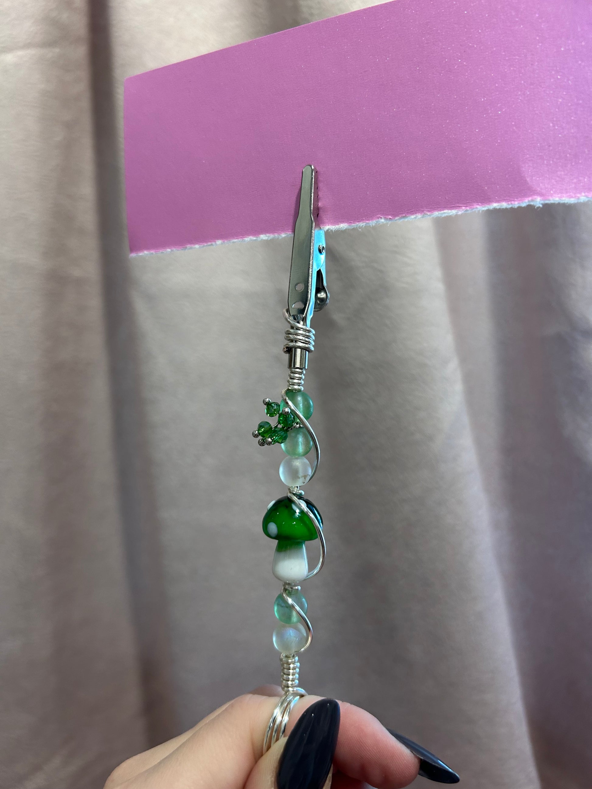 A functional tool with a little sparkle, this clip features a sturdy clasp attached to a comfortable ring-style base. The secure grip makes it ideal for holding cards, notes, small lightweight items or crafts especially with long nails! The handcrafted beaded wire design adds a unique touch.