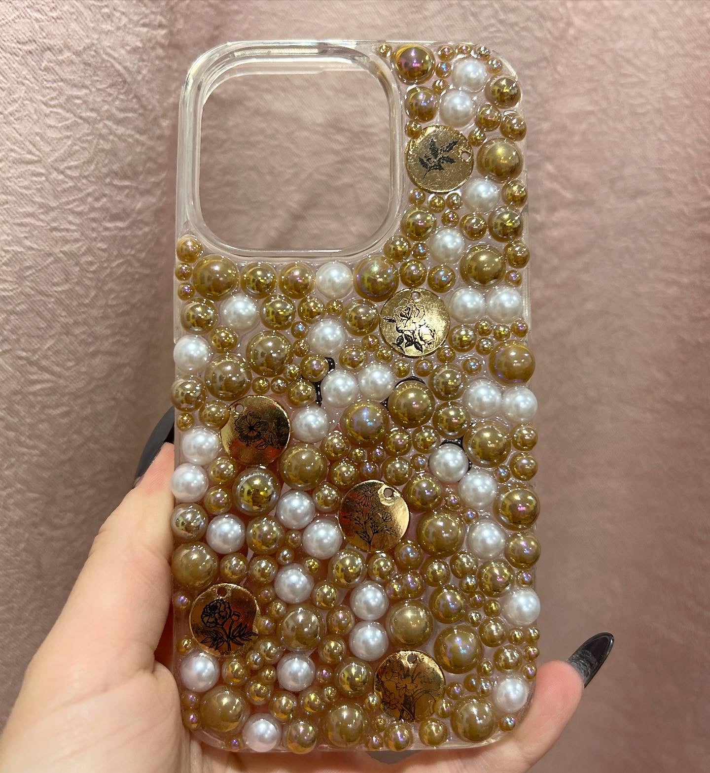 Elevate your phone with this handcrafted iPhone 14 Pro case, designed for those who love a touch of luxury. This clear case is fully adorned with a mix of high-shine golden pearls and luminous white pearls, giving it a rich, dimensional sparkle from every angle. Scattered throughout are gold-toned coin charms featuring delicate floral etchings, adding a romantic vintage-inspired touch.